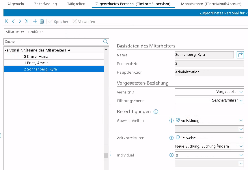 Damit Abwesenheits- und Zeitkorrekturanträge gestellt werden können, müssen die Vorgesetzten für das Personal gepflegt werden. Im Personalstamm → Zugordnetes Personal kann der Vorgesetzte eingetragen werden. Zudem kann angegeben werden, welche Art von Anträgen der Vorgesetzte genehmigen darf.