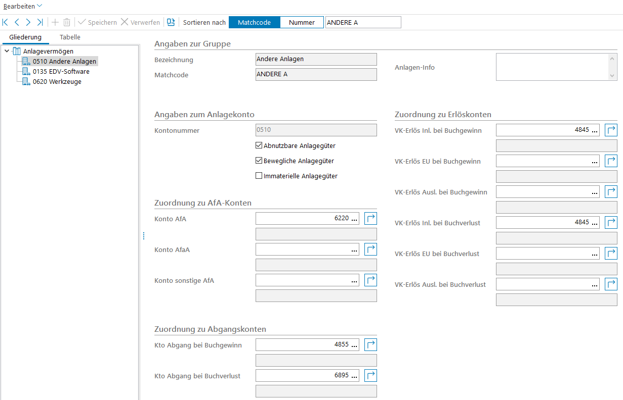 Hier lassen sich auch die einzelnen Anlagekonten bearbeiten, um die bezogenen Sachkonten für die Buchungsvorgänge zu definieren.