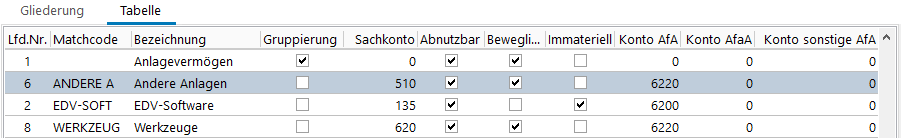 Die Tabellenansicht stellt die bezogenen Anlagegruppen und -konten tabellarisch als Browser dar. Dabei werden zusätzliche Informationen wie der Typ der darin enthaltenen Anlagegüter oder die bezogenen AfA-Konten zu den Datensätzen angezeigt.