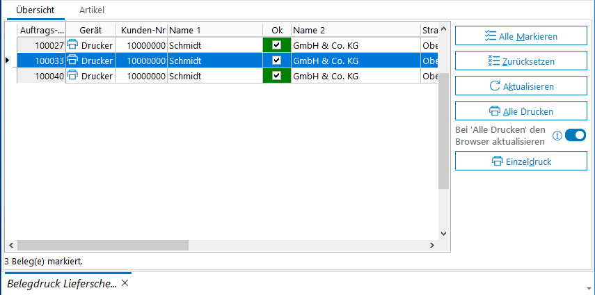 Weitere Hinweise zur Bedienung des Auswahlfensters (Funktionen: Markieren, Zurücksetzen, Aktualisieren, Alle Drucken, Einzeldruck und Layout) finden Sie in den Allgemeinen Informationen zum Belegdruck. Siehe dazu hier.