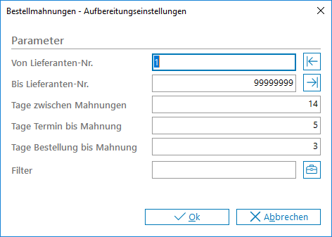 Rückständige Lieferantenbestellungen können hier gemahnt werden. Der Nummernkreis der zu mahnenden Lieferanten sowie der einzelnen Mahnintervalle können als Parameter festgelegt werden.