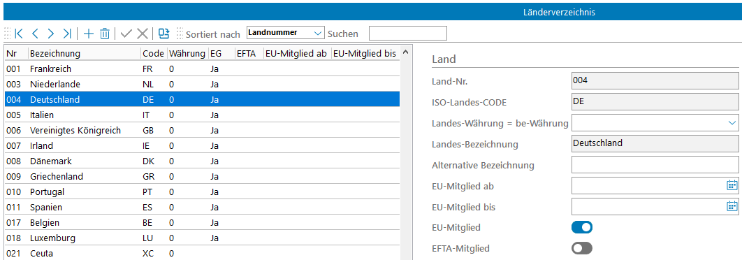 Hier kann eine Liste aller gültigen Ländernummern mit den dazugehörigen Länderbezeichnungen und EU-, EFTA- und Währungskennzeichen aufgerufen und bearbeitet werden.