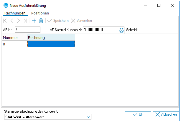 Durch Neu (F4) rufen Sie die Funktion Erstellen Ausführerklärung für Rechnungsnummern auf.