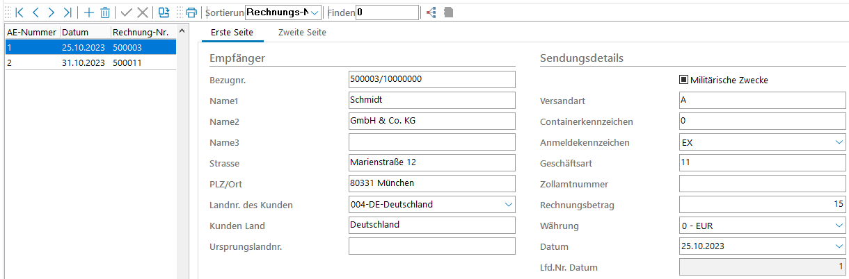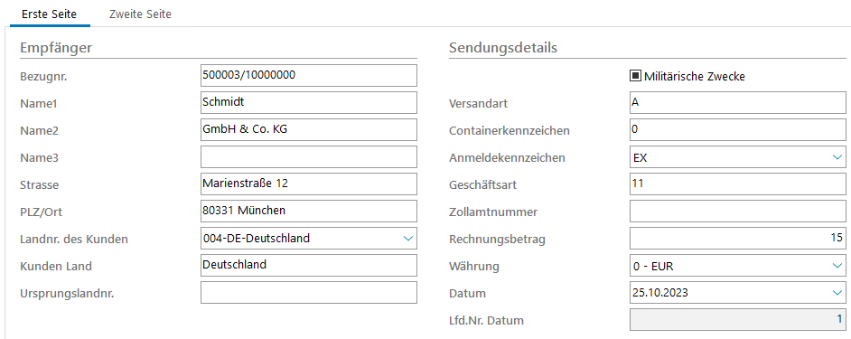 Ausfuhrerklärung-Kopfdaten – Erste Seite