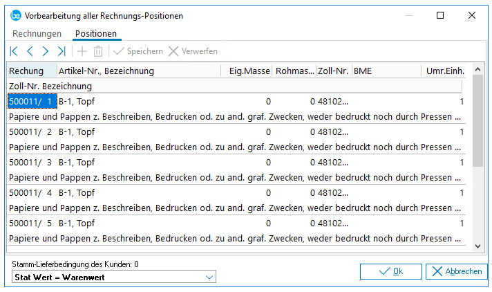 Ausfuhrerklärung: Vorbearbeitung aller Rechnungs-Positionen