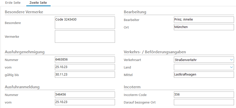Auf der zweiten Seite sind weitere Felder für die Ausfuhrerklärung vorhanden: