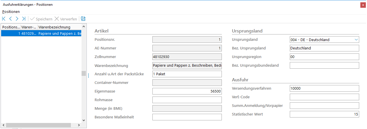 Positionen anzeigen | Anzeige der einzelnen Positionen der Ausfuhrerklärung, siehe dazu hier. |