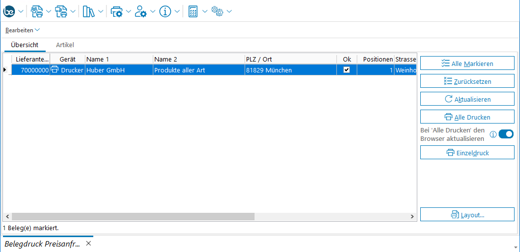 An dieser Stelle können alle hinterlegten Preisanfragen im Stapel gedruckt werden. Die Preisanfrage kann in den Artikeln unter Bearbeiten > Preisanfrage artikelspezifisch ausgelöst werden. Siehe dazu auch hier.