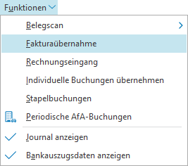 Mit dieser Funktion können Sie über Funktionen > Fakturaübernahme alle Fakturadaten aus der business express Auftragsabwicklung übernehmen. Das Programm übernimmt die Daten aller Rechnungen, Storno-Rechnungen und Gutschriften, die im eingegebenen Zeitraum gedruckt wurden.