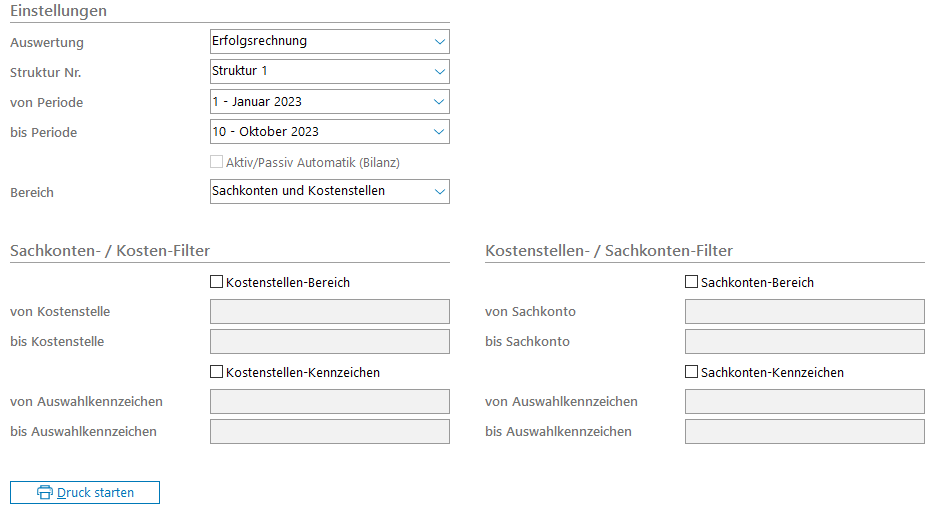 Kostenstellen- / Sachkontenfilter | Nur für die Erfolgsrechnung bei den ausgewählten Bereichen Sachkonten und Kostenstellen / nur Kostenstellen. Feld Sachkonten-Bereich: Eingrenzung von/bis Sachkonto möglich. Feld Sachkonten-Kennzeichen: Eingrenzung von/bis Auswahlkennzeichen möglich. |