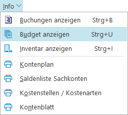 Mit dieser Funktion können Sie über Strg+U oder Info > Budget anzeigen für beliebige Kostenarten Kostenstellenbezogene Budgets hinterlegen. Diese Funktion steht nur bei Kostenstellen-Konten zur Verfügung.