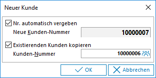 Neu (F4) | Durch die Auswahl des Symbols können Sie den Dialog für die Anlage eines neuen Kunden starten. ![]() Sie können eine neue Kunden-Nr. entweder manuell eingeben oder automatisch aus der in den Festwerten hinterlegten Nummernserie generieren lassen. Die Eingabe der Kunden-Nr. bestätigen Sie bitte mit Enter. Das System prüft, ob die Kunden-Nr. bereits existiert. Mit der Schaltfläche OK können Sie den neuen Kunden im System anlegen und auf der Debitorenstammmaske mit der Eingabe der Daten fortfahren. Mit der Schaltfläche Abbrechen verwerfen Sei die Neuanlage. Hinweis Wenn Sie "Nr. automatisch vergeben" und „Existierenden Kunden kopieren" in Kombination verwenden, können Sie einfach und schnell einen neuen Kunden anlegen. |