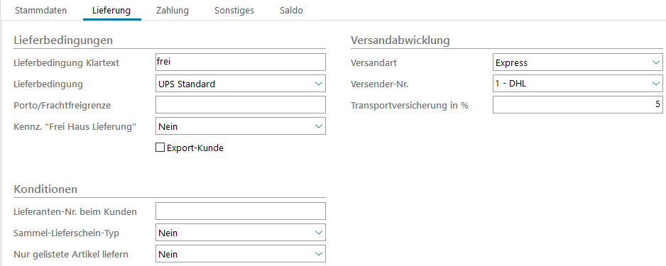 Lieferbedingung | Definiert die Standard-Lieferbedingung. Die Auswahlmöglichkeiten der Drop-Down-List werden über Festwerte > Allgemeine Parameter > Kunden/Vertrieb > Lieferbedingungen/Anrede individuell festgelegt. Die Lieferbedingung kann in der Auftragserfassung verändert werden. ![]() |