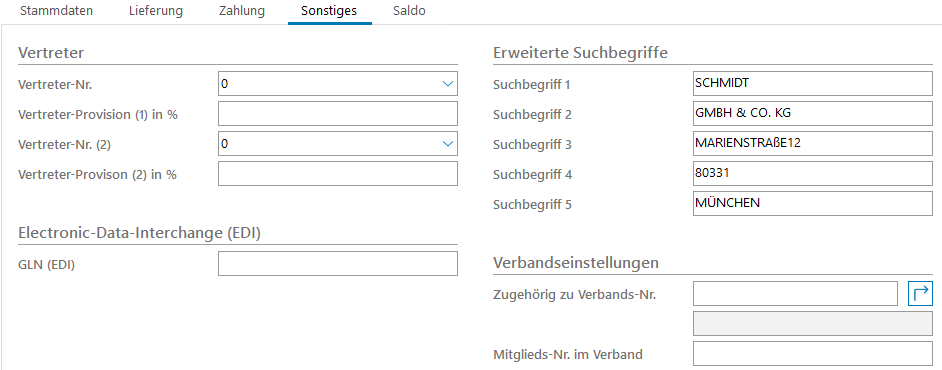 Suchbegriff 1-5 | Anzeige von fünf zusätzlichen Suchbegriffen bzw. Matchcodes für die Suche im Kundenstamm. Hinterlegte Suchbegriffe erleichtern das schnelle Auffinden von einzelnen Kunden-Datensätzen. |