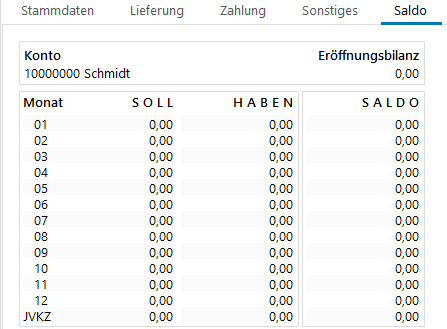 Kontoübersicht des aktuellen Debitors über Soll, Haben und den Saldo für die aktuelle Periode.