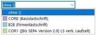 SEPA-Produkt | Angabe des SEPA-Produkts(Basislastschrift mit normaler/verkürzte Laufzeit, Firmenlastschrift), , welches für den Kunden standardmäßig genutzt werden soll: ![]() |