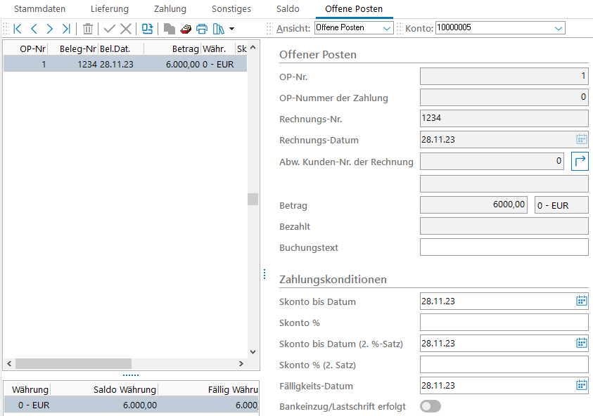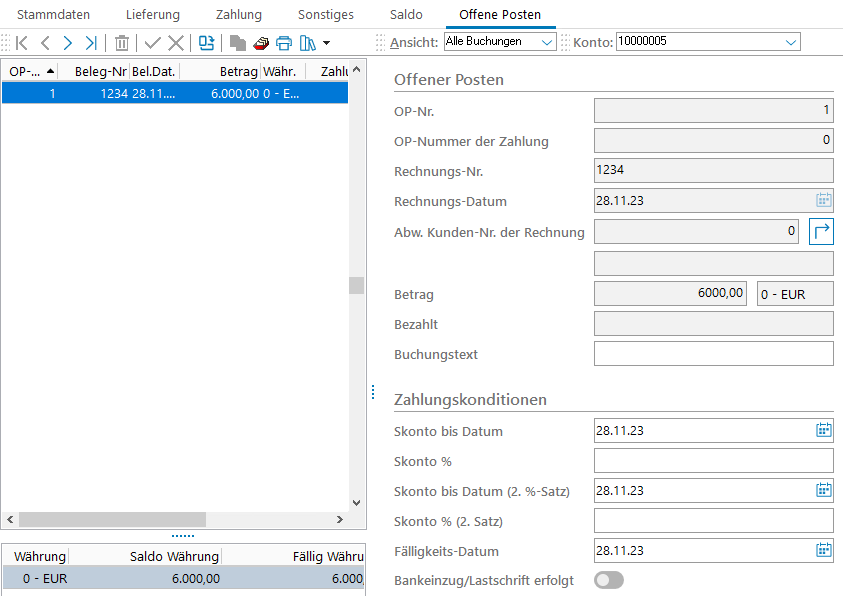 Diese Funktion zeigt über Strg+O oder Info > Offene Posten alle unbezahlt gebliebenen Rechnungen (Forderungen) an den Debitoren an. Der jeweils markierte Posten kann in der Detailansicht bearbeitet werden. Der zweite Browser gibt Auskunft darüber, wie groß der zusammengerechnete Saldo in Abhängigkeit der Währung ist.