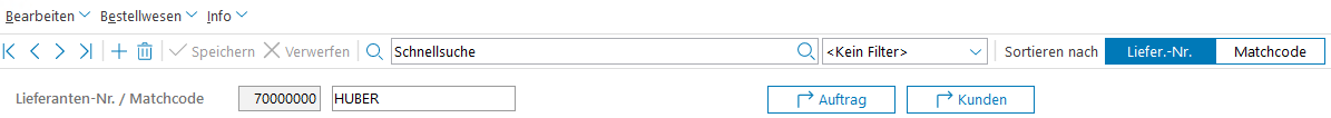 Nach Anwahl eines beliebigen Feldes in der Lieferantenstammmaske wechselt das System in den Editiermodus. Erkennbar ist der Editiermodus an dem hervorgehobenen Häkchen und an dem Verwerfen-Symbol in der Symbolleiste.