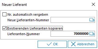Diese Funktion kombiniert die beiden oben beschriebenen Funktionen, indem ein neuer Lieferant automatisch mit neuer Nummer auf Basis des aktuellen Datensatzes angelegt wird.