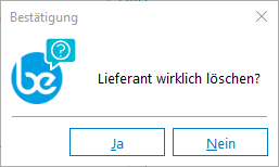 Nach Anwahl des Löschen Icons kann der angezeigte Lieferant nach einer Sicherheitsprüfung und der Bestätigung aus der Lieferantendatei gelöscht werden, sofern dieser weder Lager-, Bestell- noch Auftragsbestand hat und auch in keiner Stückliste enthalten ist.