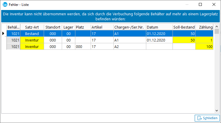 Falls bei der Übernahme ein Konflikt festgestellt wird (z.B. ein Behälter würde gleichzeitig auf zwei unterschiedliche Lager/Lagerplätze gebucht werden), so öffnet sich ein Fenster, welches die vorhandenen Konflikte in einer Übersicht anzeigt: