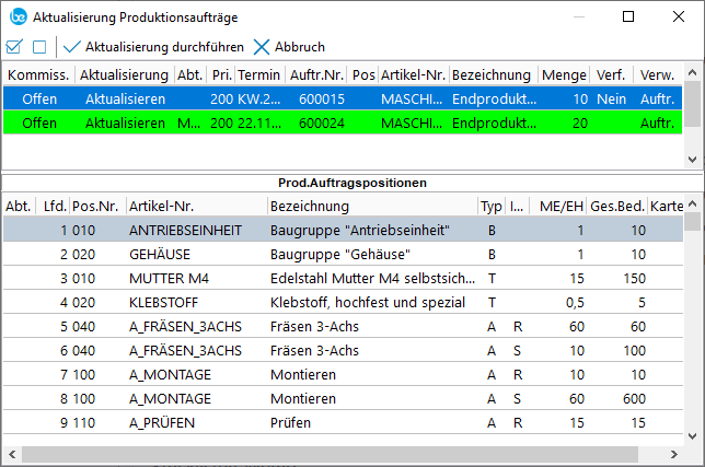 Nach Änderungen in Stücklisten besteht hier die Möglichkeit bereits bestehende Fertigungsaufträge, die noch nicht kommissioniert wurden, zu aktualisieren und die Änderung in die Fertigung zu übernehmen. In der Ansicht werden alle bestehenden Fertigungsaufträge ausgewiesen und standardmäßig auf „aktualisieren" gesetzt. Es besteht aber auch die Möglichkeit, nur einzelne Aufträge auszuwählen.