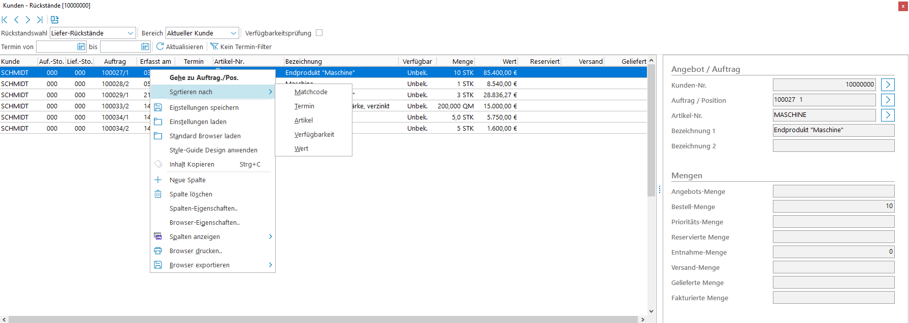Die Rückstandsansicht ist nach Kunde und Auftragsnummer sortiert und zeigt alle rückständigen Auftragspositionen mit Artikel-Nr., Bezeichnung und Rückstandsmenge an. Die Sortierung kann hierbei auch individuell erfolgen.