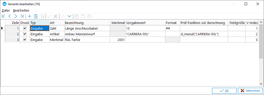 V-Index | Der hier gewählte Index verweist auf eine Variable v[x], in welche die im Variantenfenster eingegebenen Größen geschrieben werden. Diese Variable kann bei Plausibilitätsprüfung und Mengenberechnung weiterverwendet werden. Die Größe in der Klammer (im Beispiel x) steht für den gewählten V-Index im Variantenfenster. |