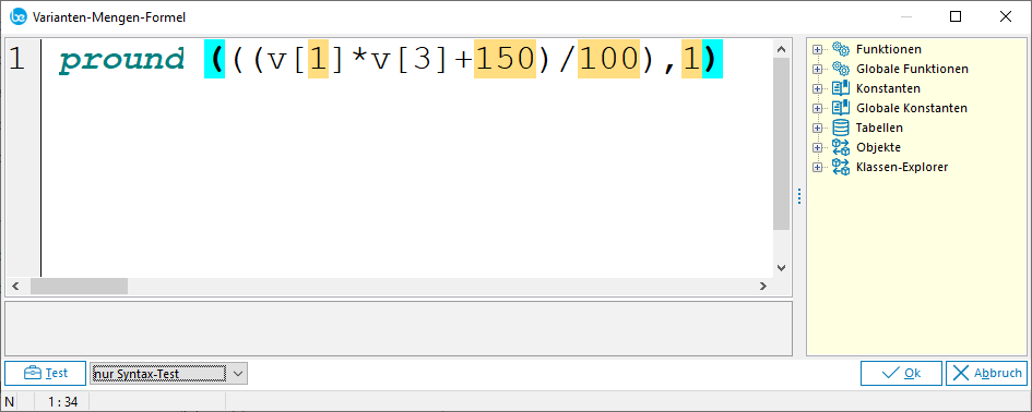In der Varianten-Stückliste kann anstelle einer fix vorgegeben Menge auch eine Mengenformel eingegeben werden (gilt auch für Dimensionen). Sie können eine Berechnungsformel eingeben, mit der die benötigte Menge vom System berechnet wird. Die bezogene Variable heißt M_Menge. Die Mengen-Berechnungsformel lässt sich mit dem Codeblock-Editor eingeben und auf Syntax überprüfen.