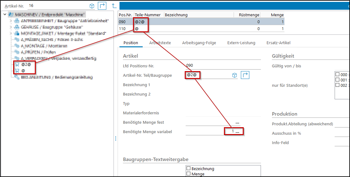 @x@ | Es wird kein fester Artikel in die Stückliste eingebaut. Erst bei Eingabe in das Varianten-Dialogfenster wird entschieden, welcher Artikel aus dem Artikelstamm in die Stückliste eingebaut wird. Das "x" entspricht der Zeilennummer des Eingabefeldes in der Variantenliste. |