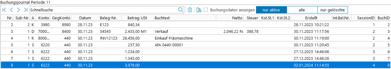 Über Funktionen > Journal anzeigen können Sie alle Buchungen der aktuellen Periode am Bildschirm anzeigen lassen. Auf der rechten Seite werden die Buchungsdaten sowie die Einträge in der Datenbank angezeigt.