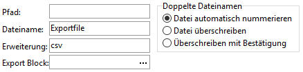 Exporttyp | Als Exporttyp kann eine CSV-Datei oder kein spezieller Typ ausgewählt werden. Bei der Auswahl einer CSV-Datei werden weitere Felder eingeblendet, in denen die Angaben für die Exportdatei (Pfad, Name und Erweiterung) sowie die Verfahrensweise für die Exportdatei bei bereits vorhandenem Dateinamen festgelegt werden. ![]() |