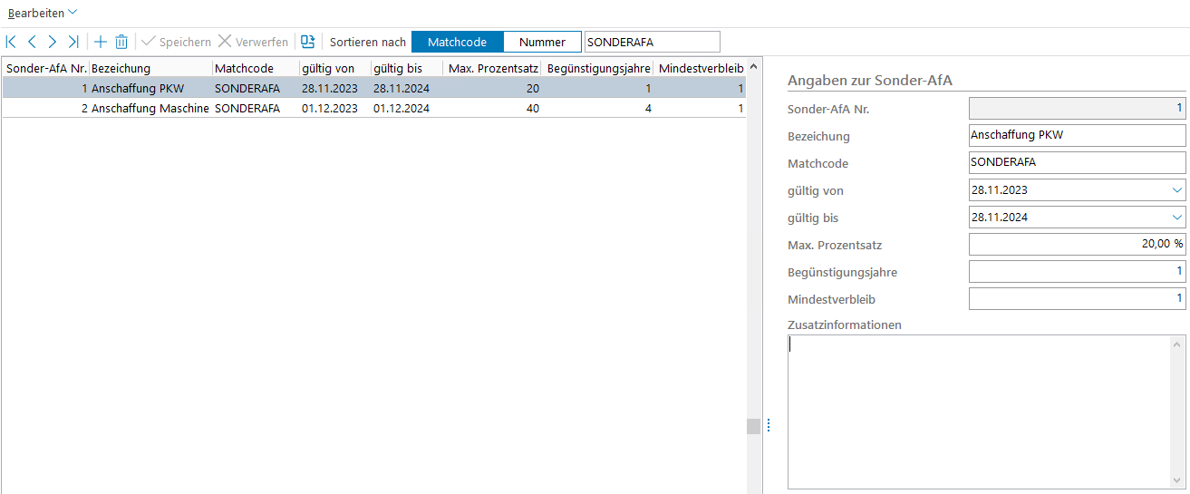 Gültig von/bis | Gültigkeitsdaten für die jeweilige Sonderabschreibung. |