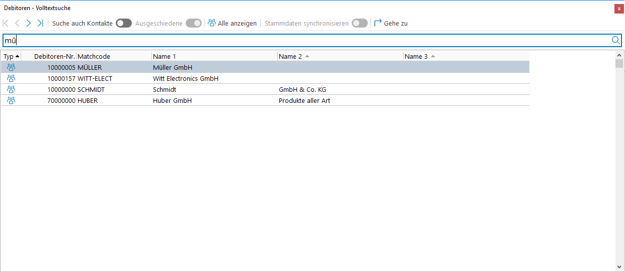 Die Gestaltung der Suchtabelle (hier Matchcode / Nummer / Name 1 / Name 2 etc..) kann individuell je Arbeitsplatz angepasst werden. Reihenfolge und Breite der Felder sind einstellbar. Weitere Informationen entnehmen Sie bitte hier.