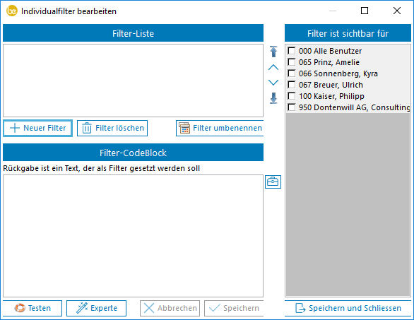 Filter sichtbar für | Sichtbarkeit für alle Benutzer „000 Alle Benutzer" oder individuelle Auswahl durch Setzung eines Hakens per Mausklick. |