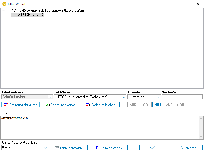 „ANZZAHL >= 10" filtert alle Kunden, bei denen mehr als 10 Zahlungseingänge angefallen sind. Alle Kunden oder Interessenten, die diesen Filter nicht passieren, werden bis zur Auflösung des Filters im Kundenstamm nicht mehr angezeigt.