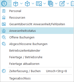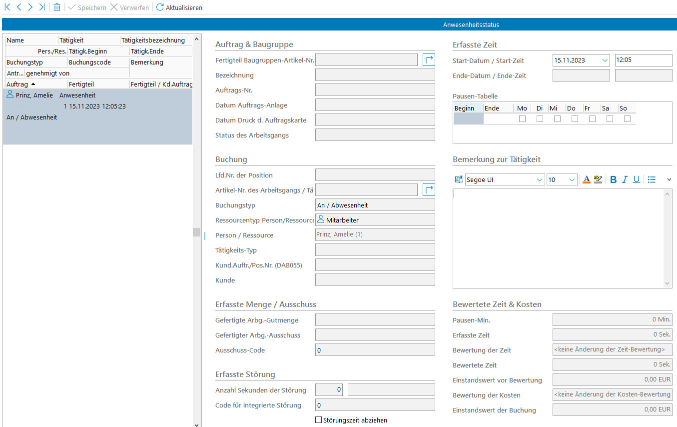 Alle gerade anwesenden Mitarbeiter werden in diesem Fenster aufgelistet. Start-Datum und -Zeit sowie Bemerkungen können bearbeitet werden.