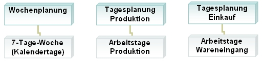 Standardmäßig arbeitet die tagesgenaue Planung mit einer Woche von 5 Arbeitstagen, anstelle von einer 7-Tage-Woche in der Wochenplanung, sofern diese Tages-Parameter für Produktion und Einkauf noch nicht über die Festwerte angepasst wurden.
