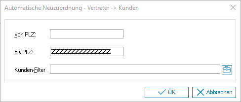 alls sich die interne Aufteilung der Postleitzahl-Gebiete ändert, erfassen Sie diese Veränderung zuerst in der Zuordnungstabelle. Es ist jetzt auf Grund der veränderten Situation notwendig, im Vertreterstamm eine Neuzuordnung von Vertreter und Postleitzahl durchzuführen. Dieser Programmteil führt diese Neuzuordnung automatisch durch.