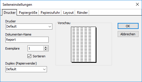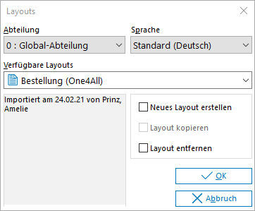 Für die Druckausgabe können vorhandene Layouts oder selbst definierte Layouts jeweils für die gewünschte Abteilung und/oder Sprache verwendet werden.