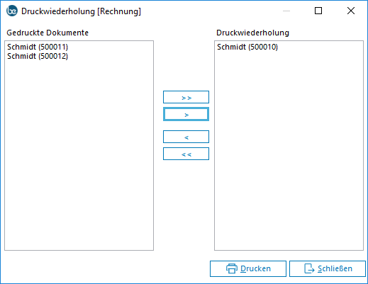 Wenn Sie Alle Drucken wählen, steht Ihnen eine Wiederholungsfunktion zu Verfügung, wenn der entsprechende Parameter in den Druckzuweisungen gesetzt ist.