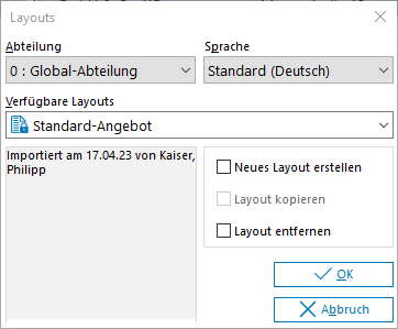 Sollten Sie für die betreffende Abteilung oder Sprache noch kein eigenes Layout angelegt haben, kann dieses an dieser Stelle angelegt werden.