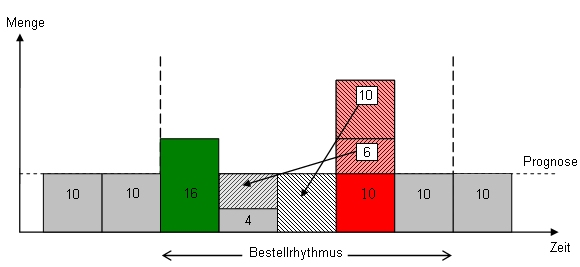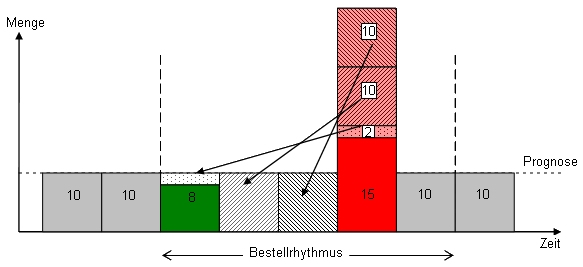 In der Berechnung ist zunächst eine Fallunterscheidung nötig: Es muss das Auftragsvolumen in der Summe (vom ersten Tag des Bestellrhythmus bis zum letzten Auftrag innerhalb des Bestellrhythmus, der die tägliche Prognose übersteigt) mit der Summe der einzelnen Tagesprognosen innerhalb dieses Intervalls verglichen werden. Dabei werden als letzte Aufträge > Tagesprognose nur solche Aufträge angesehen, die nicht vollständig mit den vorherigen Tagesprognosen verrechnet werden können (vgl. dazu auch Ansatz auch Fall 2 der Fallunterscheidung). Für vollständig verrechenbare Aufträge können die jeweiligen Tagesprognosen als Berechnungsgrundlage verwendet werden: