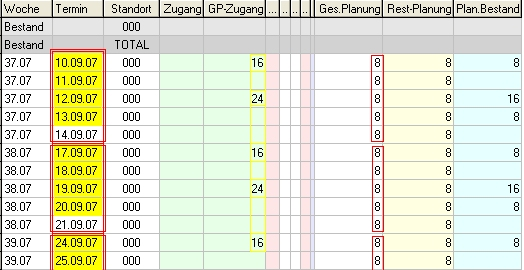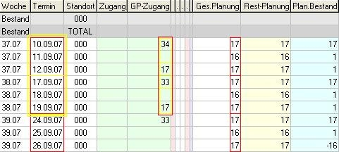 Im Terminraster wird diese Dispositionsberechnung mit Glättung dann in den einzelnen Spalten folgendermaßen angezeigt: