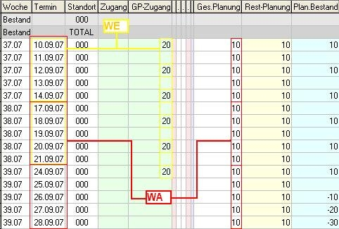Allgemein lässt sich festhalten, dass für diese spezielle Fälle der Disposition für die Berechnung der Mengen und Termine immer die kleinere Anzahl (min(ArbeitstageWE, ArbeitstageWA)) und das jeweilige Verhältnis der Arbeitstage von Wareneingang und Warenausgang relevant sind.