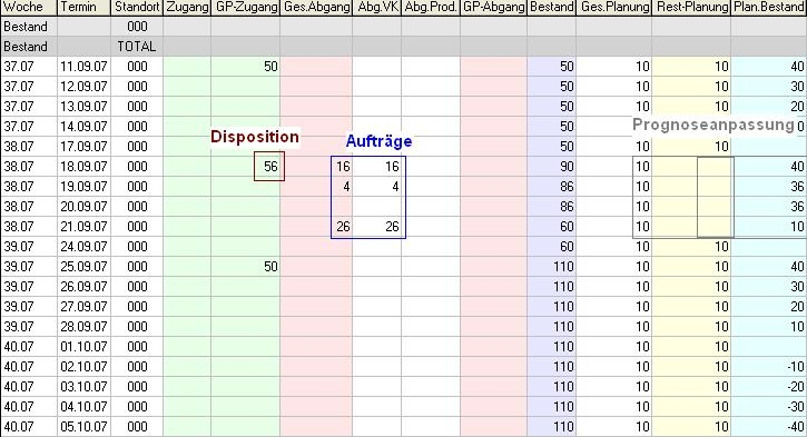 So werden die Prognosen (ohne konkrete Aufträge) vor den Auftragsterminen um die anteilige Menge der Aufträge aufgefüllt und diese von den Aufträgen subtrahiert.