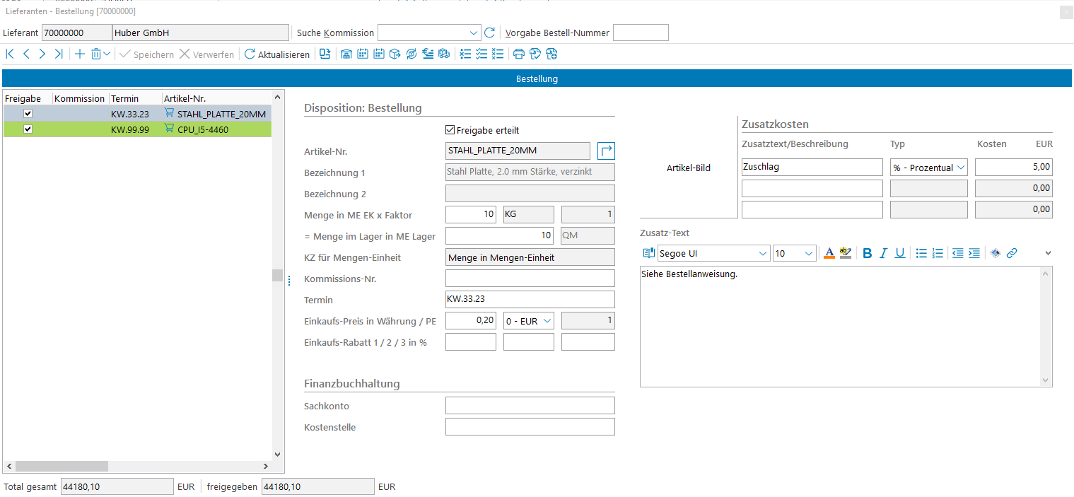 Hier werden Bestellungen an die Lieferanten manuell erfasst und bearbeitet. Sofern für den aktuellen Lieferanten bereits Bestellungen erfasst sind bzw. die freigegebenen Bestellpositionen aus der Planung übernommen wurden, werden diese automatisch wie unten dargestellt angezeigt. Der Ablauf zur Neueingabe ist identisch mit dem Ändern oder Löschen von Positionen.