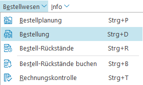 Bestellung (ohne Druck) | Freigabe der eingegebenen Dispositionen des aktuellen Lieferanten als Bestellrückstand, ohne zuvor eine Bestellung auszudrucken (z.B. nach telefonischer Bestellung). |