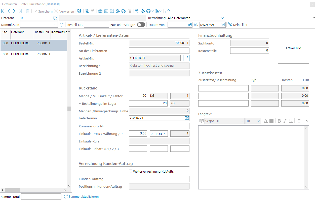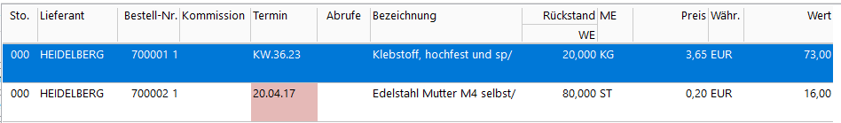 Termin | Vorgegebener Liefertermin (KW oder tagesgenau, "KW.99.99" für Abruf). Im Bestellrückstand werden der Wunschtermin, der durch den Lieferanten bestätigte Termin, sowie der tatsächliche Termin (Buchung) geführt. Die 3 Termine werden bei der Zubuchung in die Statistik übernommen, so dass eine Auswertung über die jeweiligen Abweichungen erstellt werden kann. |