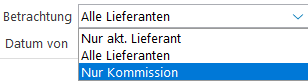 Kommissionen | Nur aktiv, wenn im Feld Betrachtung die Option Nur Kommission gewählt wurde. ![]() Wählen Sie aus der Dropdownliste die gewünschte Kommission mit den Cursortasten oder mit der Maus aus. ![]() |